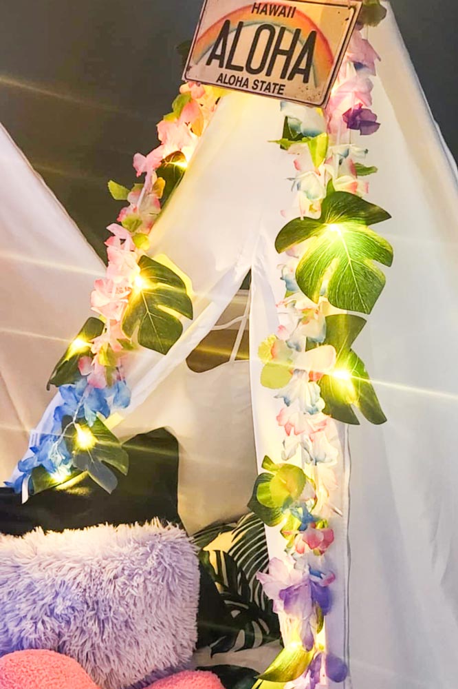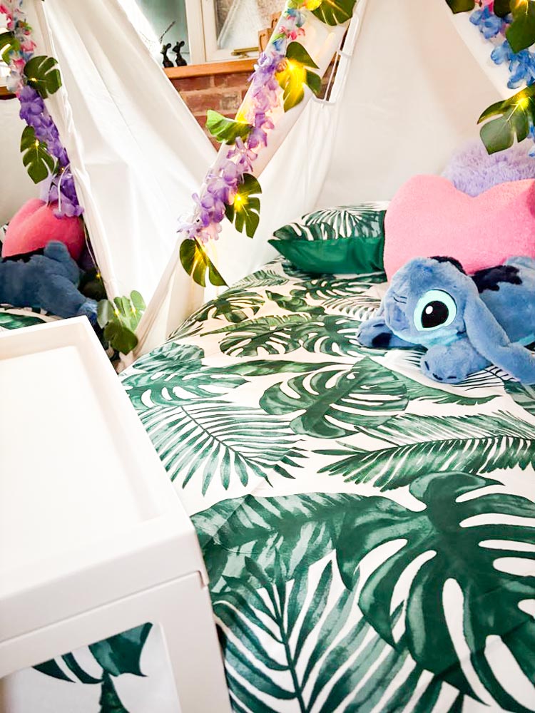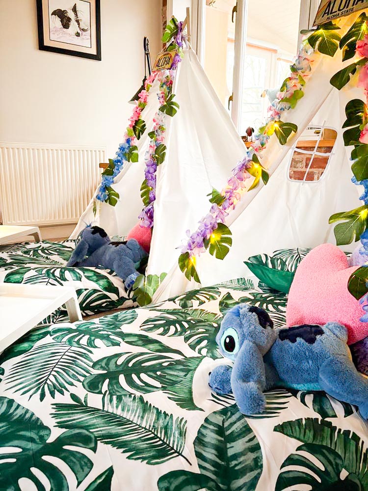 Hawaiian vibes with Stitch décor, tropical accents and playful island-themed styling.